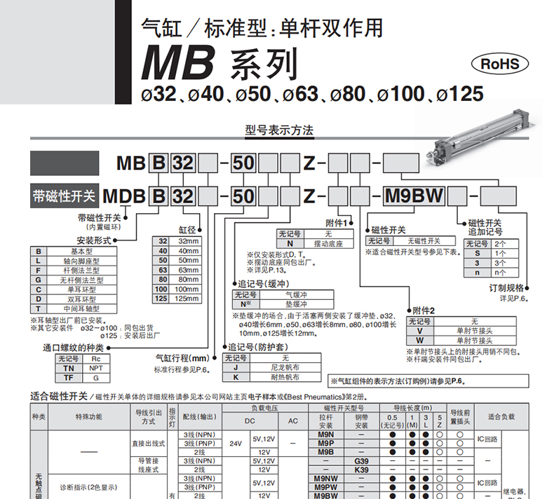 SMC标准气缸MDBB/MBB32 40 50 63 80 100 125-50-100-150-200500Z
